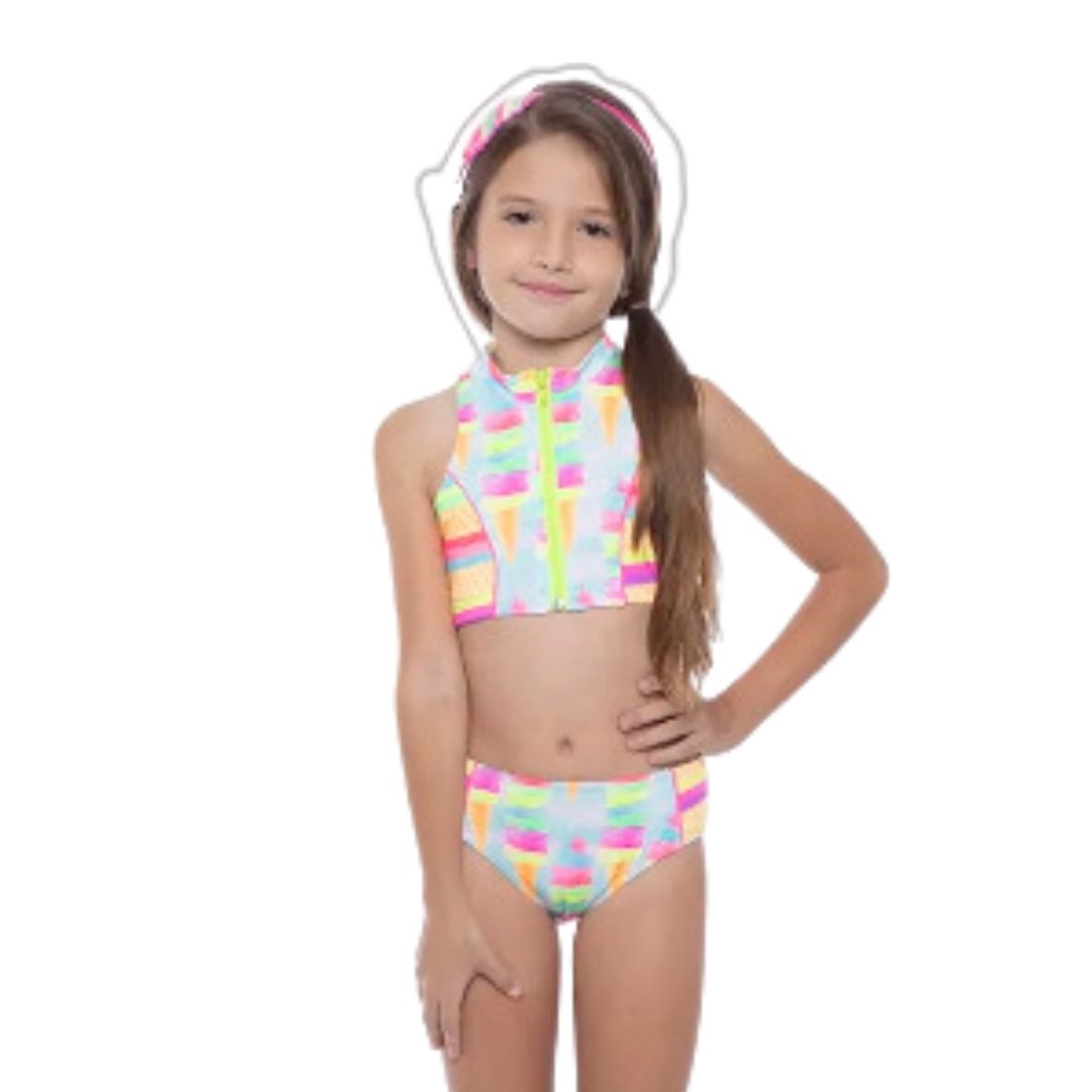 Biquíni infantil confeccionado com tecido de qualidade, trazendo um conforto maior a criança. Composto por um cropped com zíper rosa neon e calcinha com elástico, estampa rotativa de sorvete. Possui proteção solar UV50+ para o melhor conforto das meninas, feito em lycra rosset, modelagem confortável e estilosa.