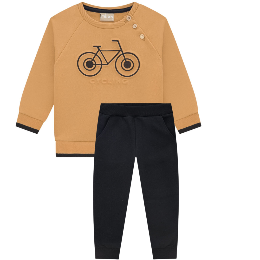 O conjunto de moletom infantil masculino é uma opção confortável e estilosa para os meninos que adoram se sentir à vontade no dia a dia. A blusa é confeccionada em um tecido macio e confortável e apresenta uma estampa de bicicleta, perfeita para os pequenos que adoram se aventurar e explorar novos lugares.