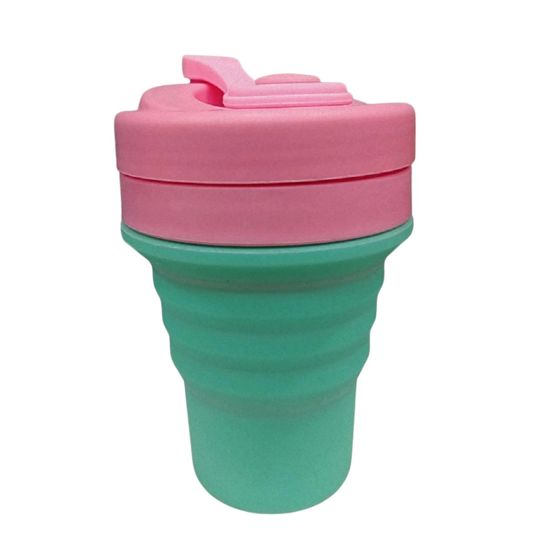 Copo em silicone. Possui forma retrátil (menor quando vazia), tampa de rosquear com bico embutido e aplique emborrachado.