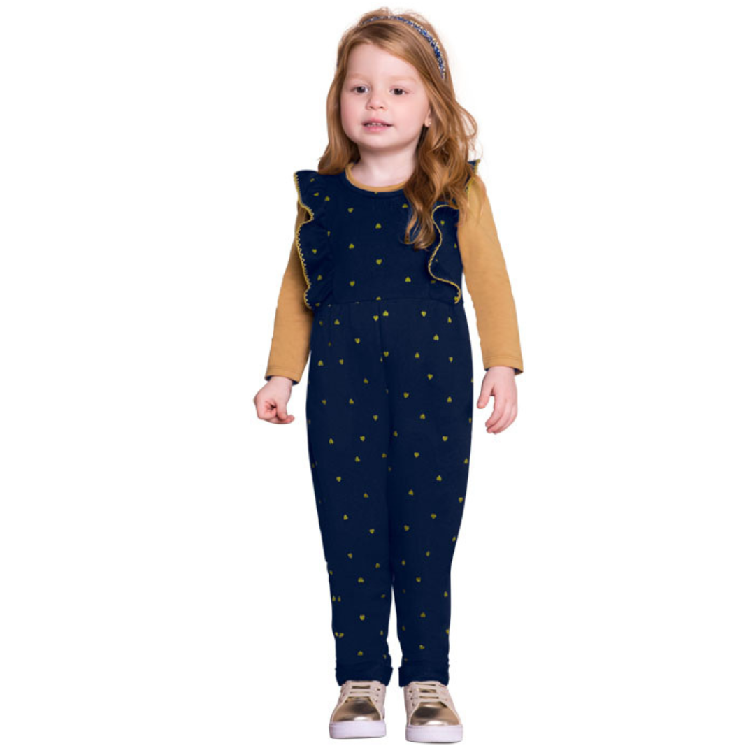 Este conjunto de jardineira infantil feminina em moletom com estampa de corações e blusa de manga longa básica em malha é uma ótima opção para o dia a dia das meninas. Confortável e charmoso, permite que elas brinquem e se divirtam livremente, ao mesmo tempo em que oferece estilo e personalidade.