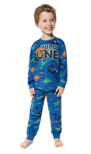 Pijama infantil masculino da marca nacional Kyly, confeccionado com tecido de qualidade trazendo um maior conforto a criança. Composto por uma camiseta manga longa escrito Wild One com estampa de dinossauro que brilha no escuro, possui punho nas mangas. Calça possui cós com elástico e punho nos pés. Modelo de pijama super confortável para as noites ficarem mais divertidas. Na Se-An Junior Moda Infantil você encotra toda linha de pijamas Kyly, o pijama 207801 está disponível na cor cinza e na cor azul.