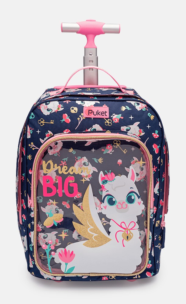 Mochila de rodas pequena em nylon com estampa corrida com glitter. Possui parte frontal em PVC transparente com estampa localizada.