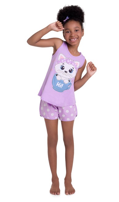 Roupa infantil feminina da marca Kyly, confeccionado com tecido de qualidade, trazendo um conforto maior a criança. Pijama composto por uma blusa regata com estampa de gatinho, que em seu contorno brilha no escuro. Short com elástico no cós, possui estampa de poá. Ideal para deixar as noites mais divertidas.