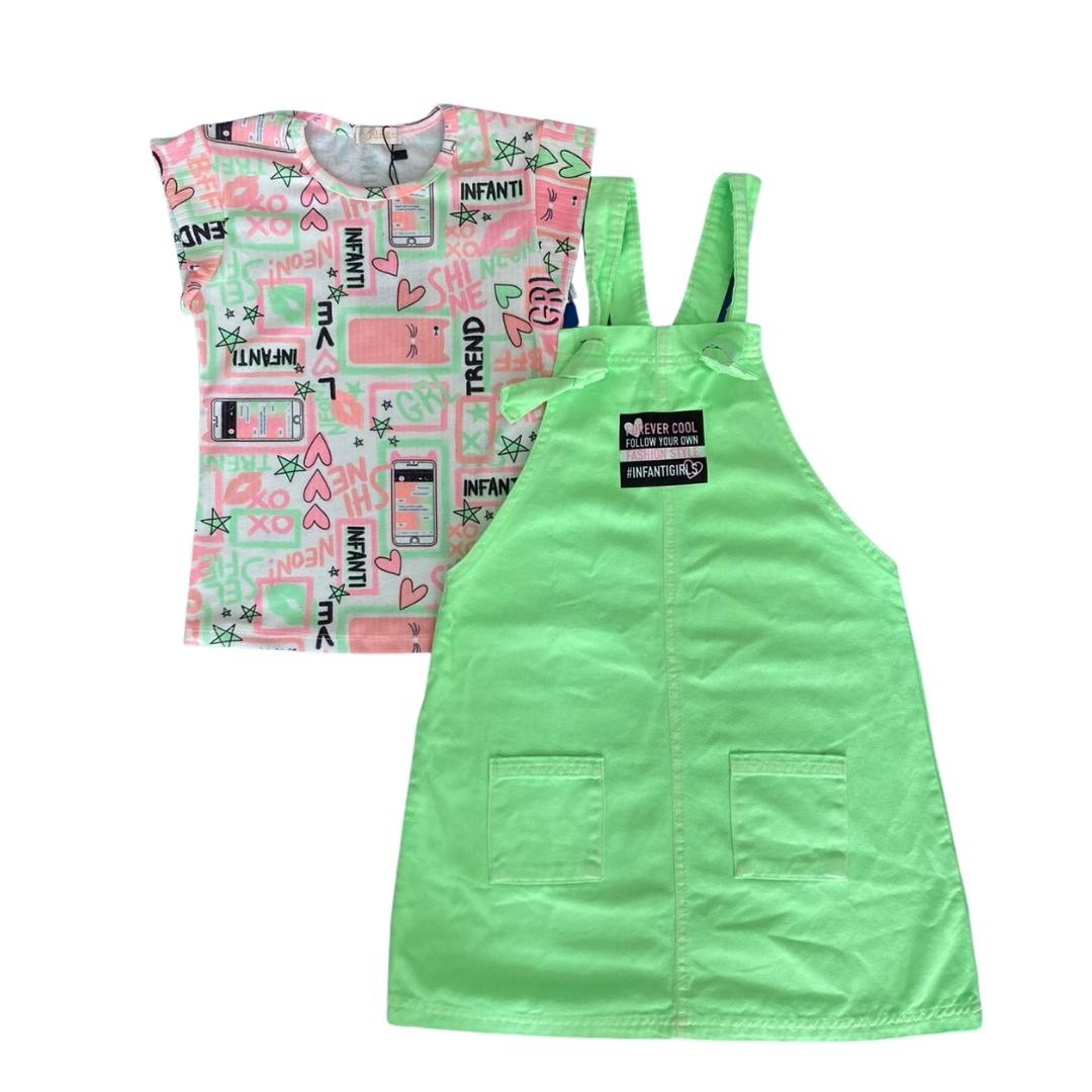 Roupa infantil feminina da marca Infanti, confeccionado com tecido de qualidade, trazendo um conforto maior a criança. Composto por um salopete verde neon, possui dois bolsinhos. Camiseta manga curta 99% Poliéster 1% Elastano, com estampa de corações, celulares, estrelas e vários escritos.
