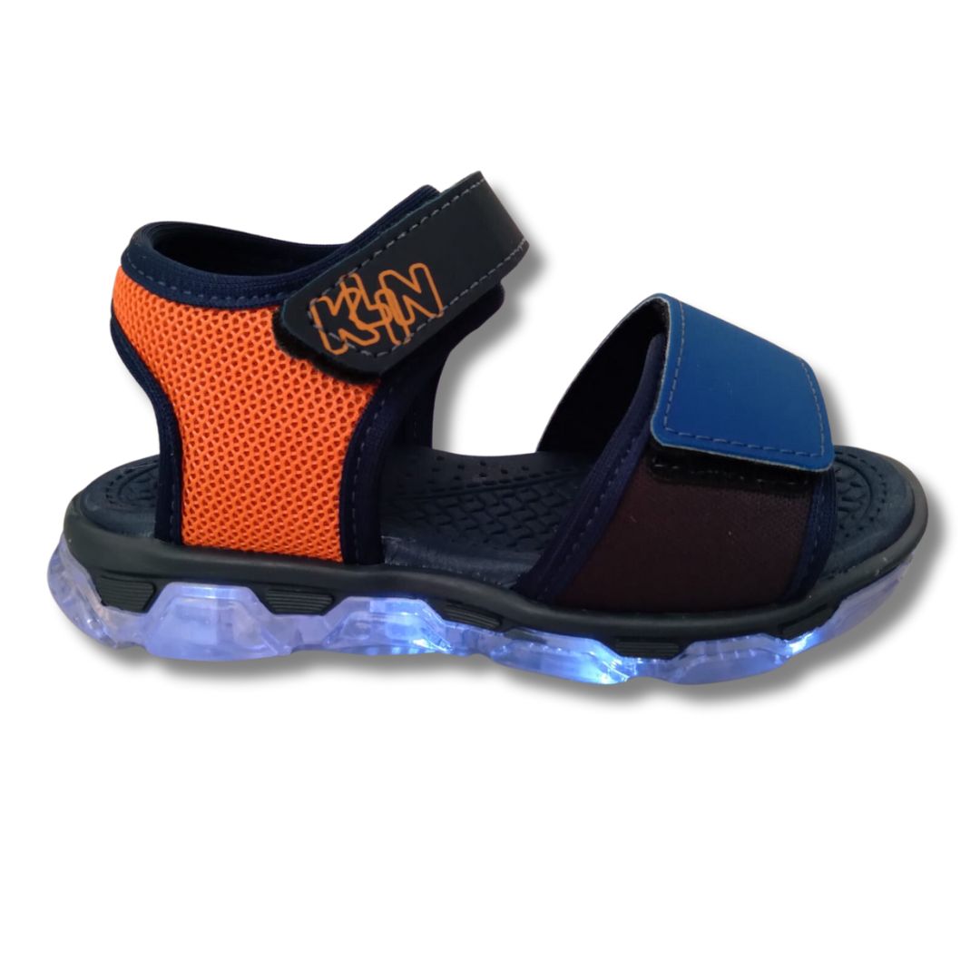 Ela é colorida, combinando as cores marinho, laranja e royal. Essa combinação de cores vibrantes pode tornar o calçado mais atraente para as crianças e adequado para diversas ocasiões informais.