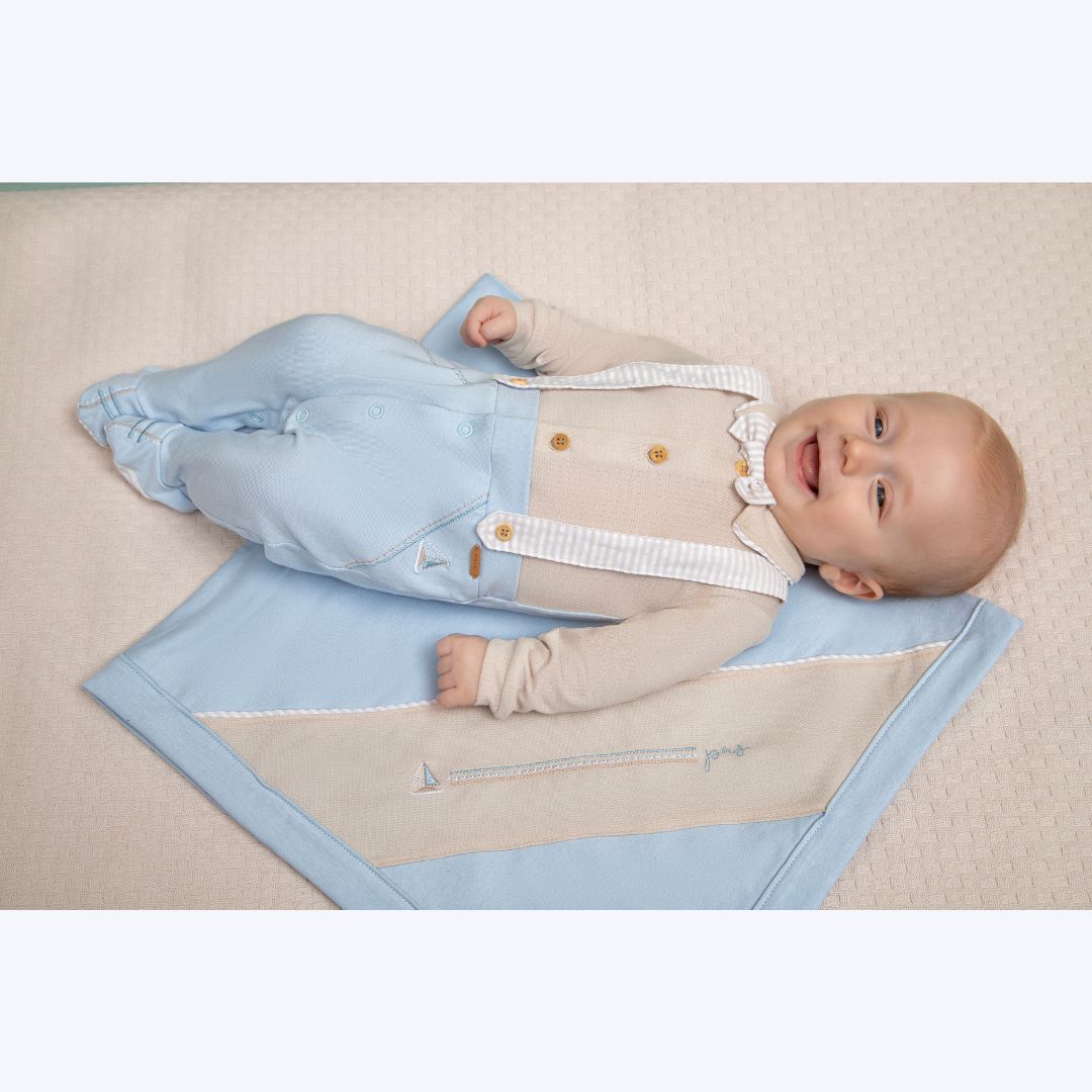 Conjunto de 2 peças, incluindo macacão longo e manta, ideal para a saída maternidade e ocasiões especiais.
