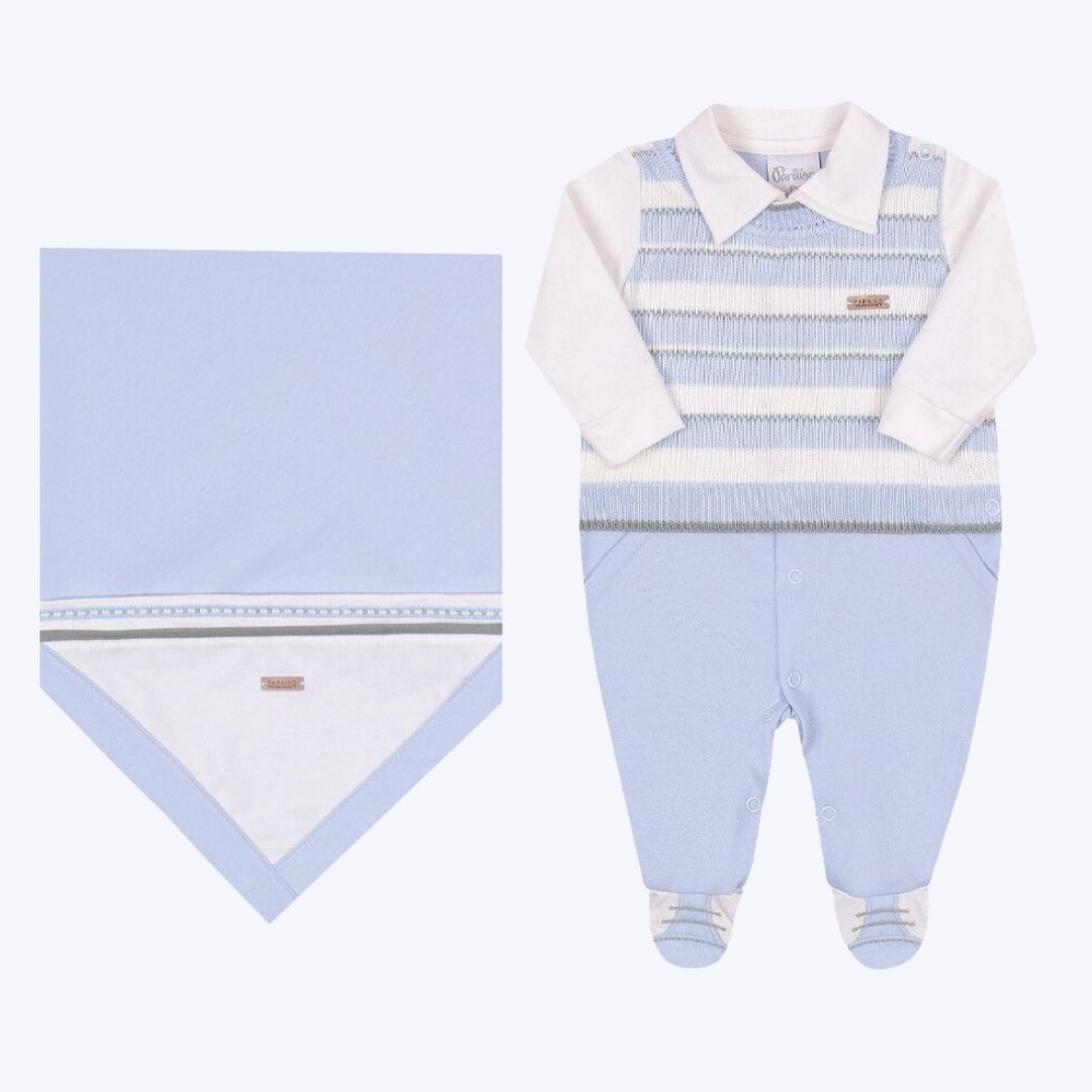 Apresentamos com carinho a Saída Maternidade de Malha com Pala de Tricô para meninos, uma escolha encantadora para receber seu bebê com estilo e conforto. Este adorável conjunto é composto por um macacão longo confeccionado em malha fio 30, destacando-se pela elegante pala de tricô no peito, e uma manta igualmente delicada também em malha fio 30.