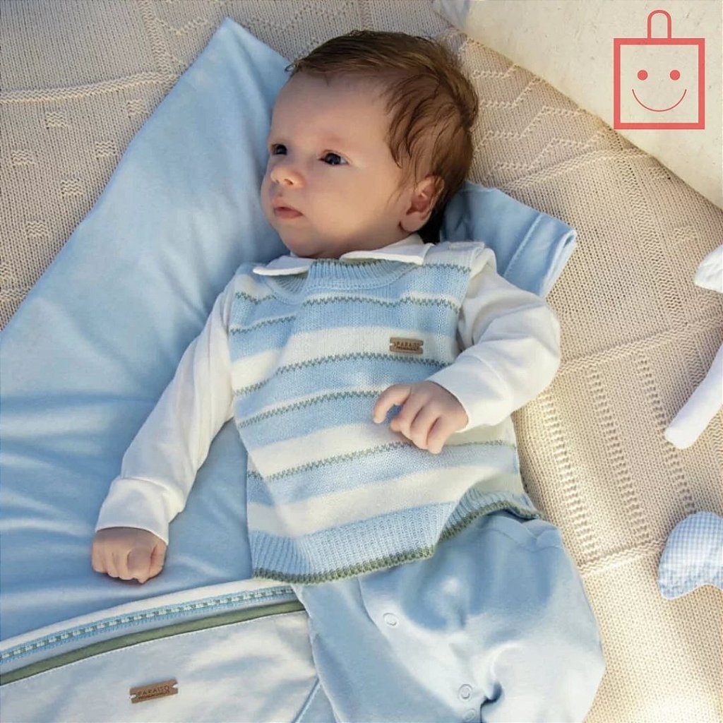 Apresentamos com carinho a Saída Maternidade de Malha com Pala de Tricô para meninos, uma escolha encantadora para receber seu bebê com estilo e conforto. Este adorável conjunto é composto por um macacão longo confeccionado em malha fio 30, destacando-se pela elegante pala de tricô no peito, e uma manta igualmente delicada também em malha fio 30.