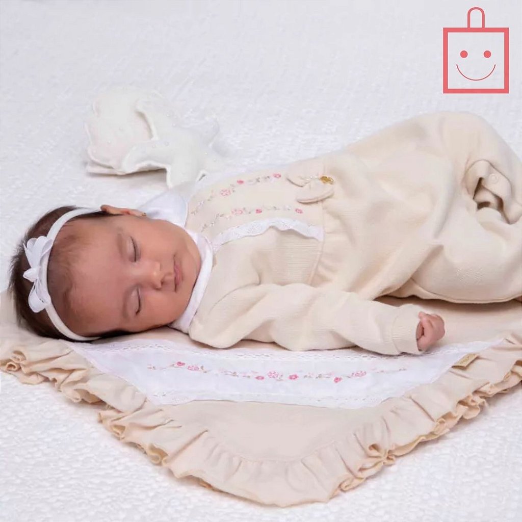 Dê as boas-vindas ao seu bebê com estilo e conforto com a Saída Maternidade Meia Estação, uma combinação encantadora de um macacão de malha trabalhada e uma manta delicadamente bordada.