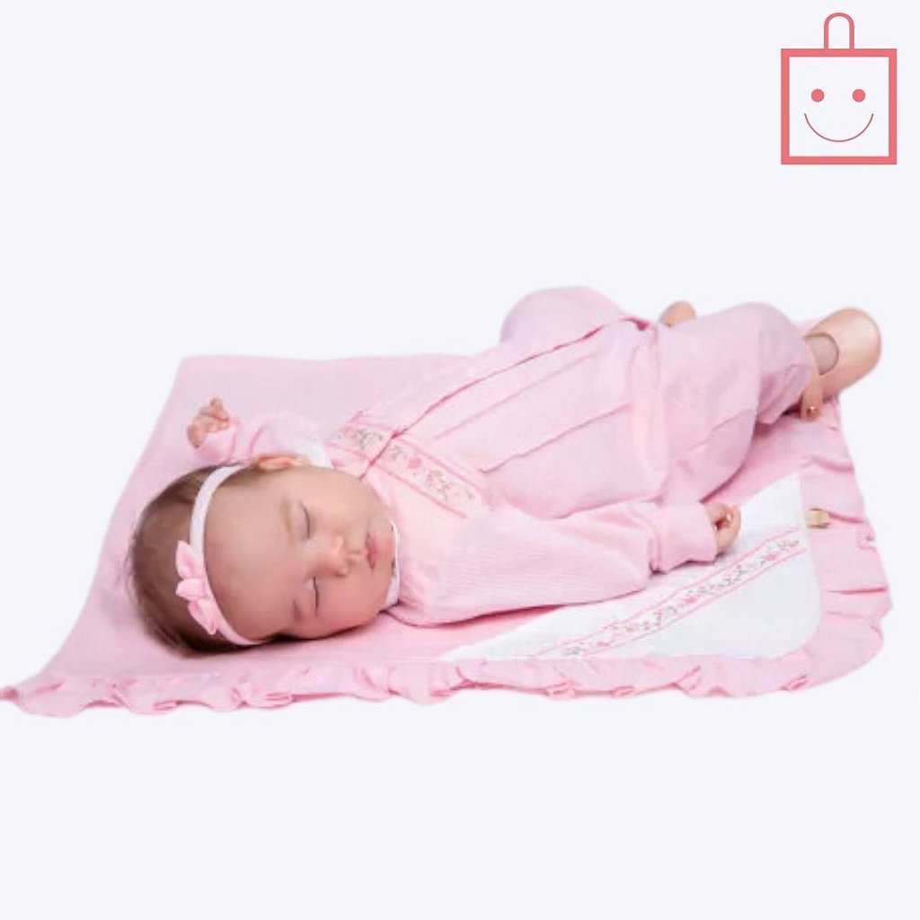 Apresentamos com carinho a Saída Maternidade Meia Estação, uma composição encantadora composta por um macacão em malha trabalhada e uma manta com detalhes bordados, perfeita para envolver sua pequena com conforto e estilo desde os primeiros momentos.