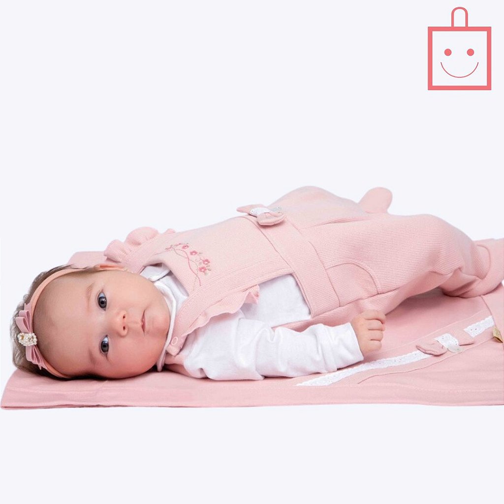 A manta, confeccionada em malha com lapela de tricotil rebatida, apresenta detalhes de lese e um laço com pingente, oferecendo um visual sofisticado e gracioso, perfeito para envolver o seu bebê com conforto e estilo.