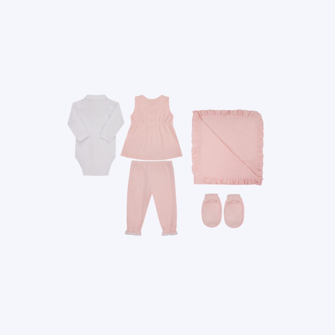 Conjunto completo e harmonioso: Inclui bata, calça, sapatinhos, manta e body, proporcionando um look coordenado para a saída da maternidade.
