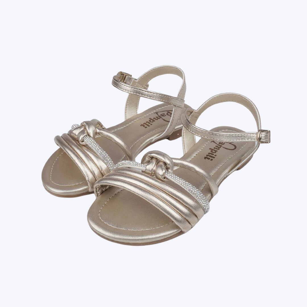 Deixe sua pequena brilhar com a Sandália Dourada Iris Nó e Strass – o par perfeito para criar momentos inesquecíveis com estilo e conforto!