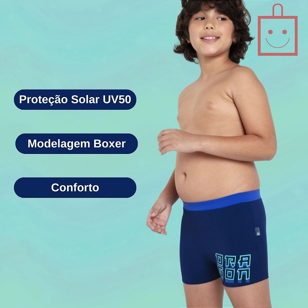 Sunga boxer possui cós com elástico embutido e cordão interno para ajuste, recorte lateral e estampa em silk localizada. Proteção solar para o melhor conforto dos pequenos, mas que não substitui o filtro solar. Estampa lisa nas cores azul marinho e verde com lettering “dragon”.