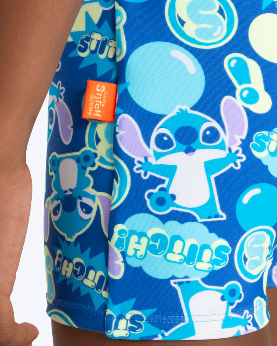 Sunga boxer Stitch. Possui cós com elástico embutido e cordão interno para ajuste. Estampa corrida.