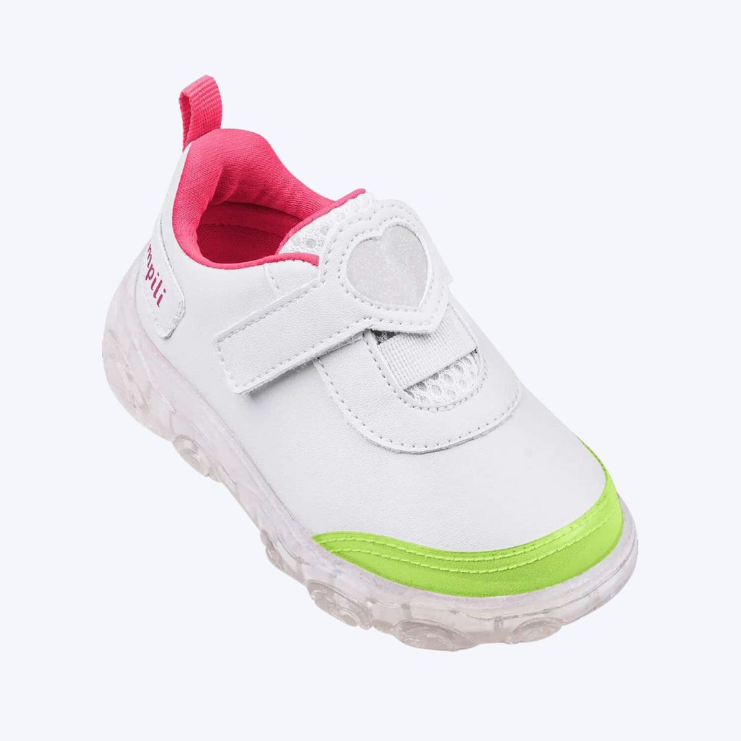 Tênis infantil feminino com luz de led no solado em sintético rosa, possui forro em tecido e espuma no calcanhar. Palmilha feet care que possui um sistema avançado de fofura, solado translúcido e glitter, em material emborrachado com detalhes em flores e com muitas cores ao caminhar. Led do solado com cores fortes e brilho intenso, sola extremamente leve e antiderrapante para as pequenas que estão se arriscando nos primeiros passos e para aquelas que amam correr e brincar muito por aí. Calce fácil através de ponta com coração de velcro e elástico, facilitando a troca para as mamães.