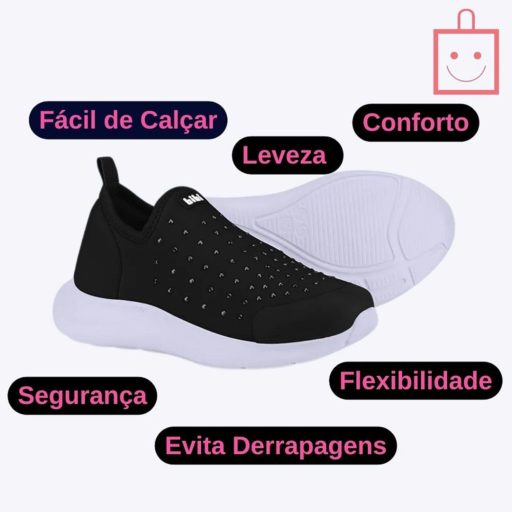 Esse tênis possui a delicadeza que as garotas adoram, com detalhes de strass e calce fácil, se torna o calçado ideal para as aventuras das crianças.