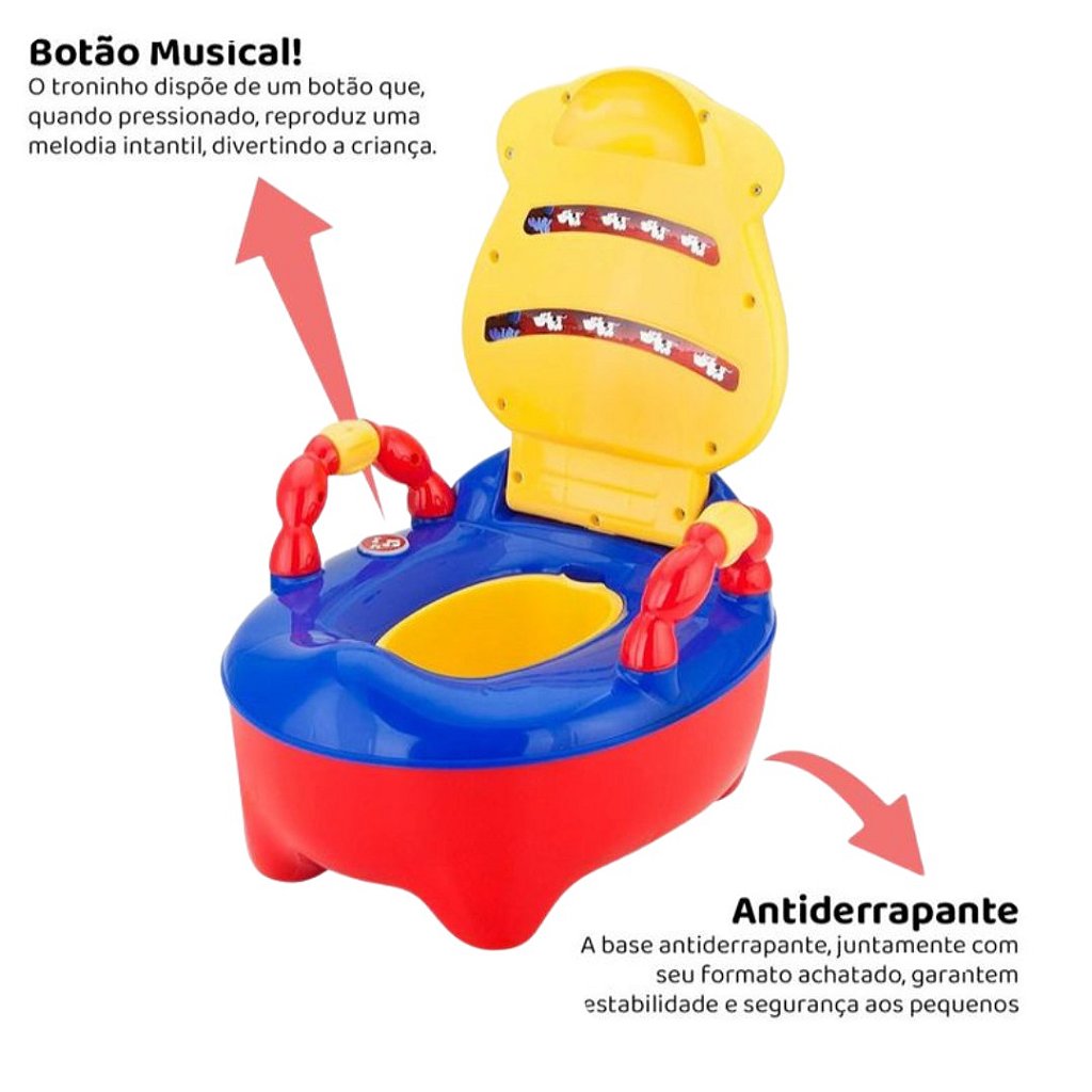 Troninho penico infantil da Prime Baby, ideal para o momento de desfralde, trazendo conforto e acolhimento, possui assento em formato anatômico confortável e reservatório removível que facilita a limpeza, também conta com um botão musical que emite uma melodia infantil, deixando o momento mais divertido.