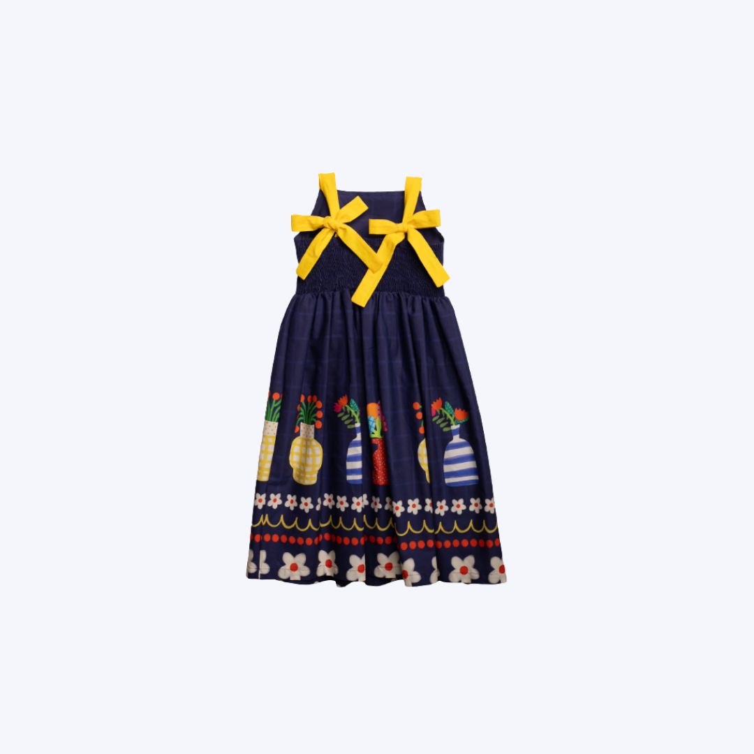 Vestido Azul Manga Curta Barrado Vaso de Flor Infantil Menina Precoce