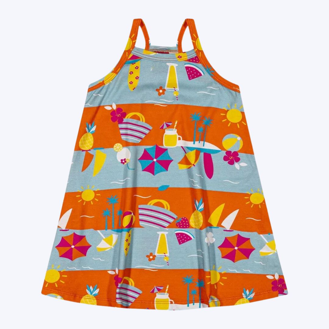 Com uma estampa alegre e divertida, este vestido traz um visual vibrante e encantador, perfeito para destacar a personalidade das meninas. O design delicado conta com decote redondo e alças com acabamento em debrum, que adicionam um toque refinado e confortável, sem abrir mão do estilo.