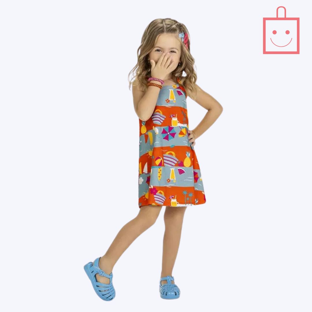 Com uma estampa alegre e divertida, este vestido traz um visual vibrante e encantador, perfeito para destacar a personalidade das meninas. O design delicado conta com decote redondo e alças com acabamento em debrum, que adicionam um toque refinado e confortável, sem abrir mão do estilo.