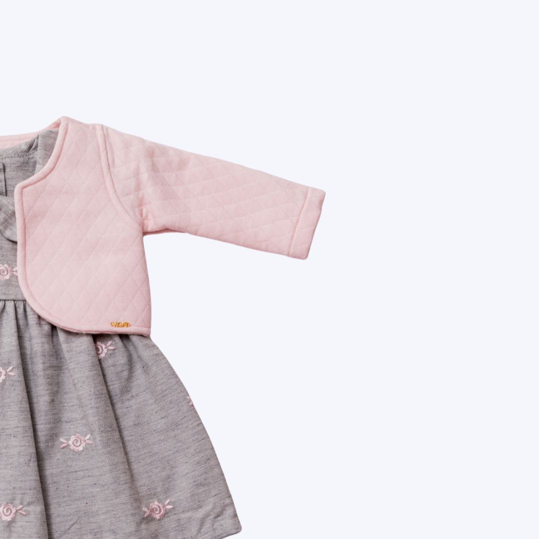 Projetado para as pequenas que merecem o melhor, esse vestido oferece uma combinação encantadora de conforto e sofisticação. Este conjunto versátil apresenta um vestido cinza delicado com um charmoso bordado de florzinha rosa, complementado por um aconchegante casaquinho bolero rosa. Ideal para manter sua bebê aquecida e estilosa em dias mais frescos, ou para um toque de elegância em eventos especiais.