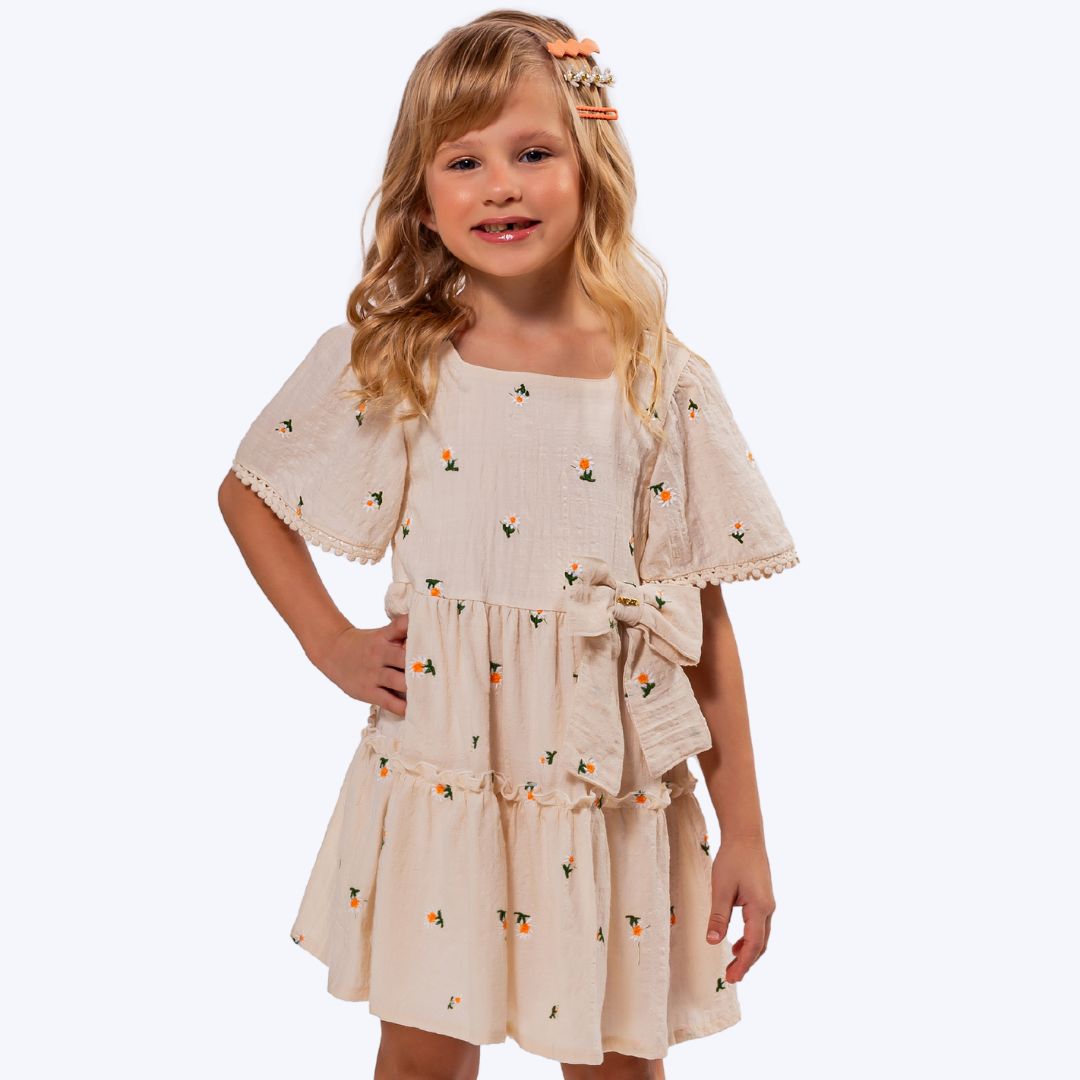 O vestido off white de manga curta é leve, confortável e perfeito para o clima quente, oferecendo a combinação ideal entre frescor e estilo. Sua cor neutra e suave permite que ele seja facilmente combinado com diversos acessórios, tornando-o ainda mais versátil. A estampa bordada de florzinha na parte frontal é o grande destaque da peça, proporcionando um toque romântico e delicado, ideal para a pequena brilhar em qualquer ocasião.