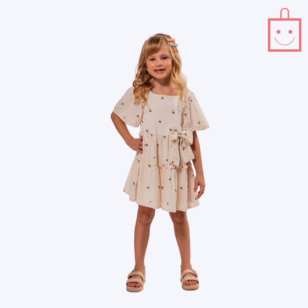 O vestido off white de manga curta é leve, confortável e perfeito para o clima quente, oferecendo a combinação ideal entre frescor e estilo. Sua cor neutra e suave permite que ele seja facilmente combinado com diversos acessórios, tornando-o ainda mais versátil. A estampa bordada de florzinha na parte frontal é o grande destaque da peça, proporcionando um toque romântico e delicado, ideal para a pequena brilhar em qualquer ocasião.