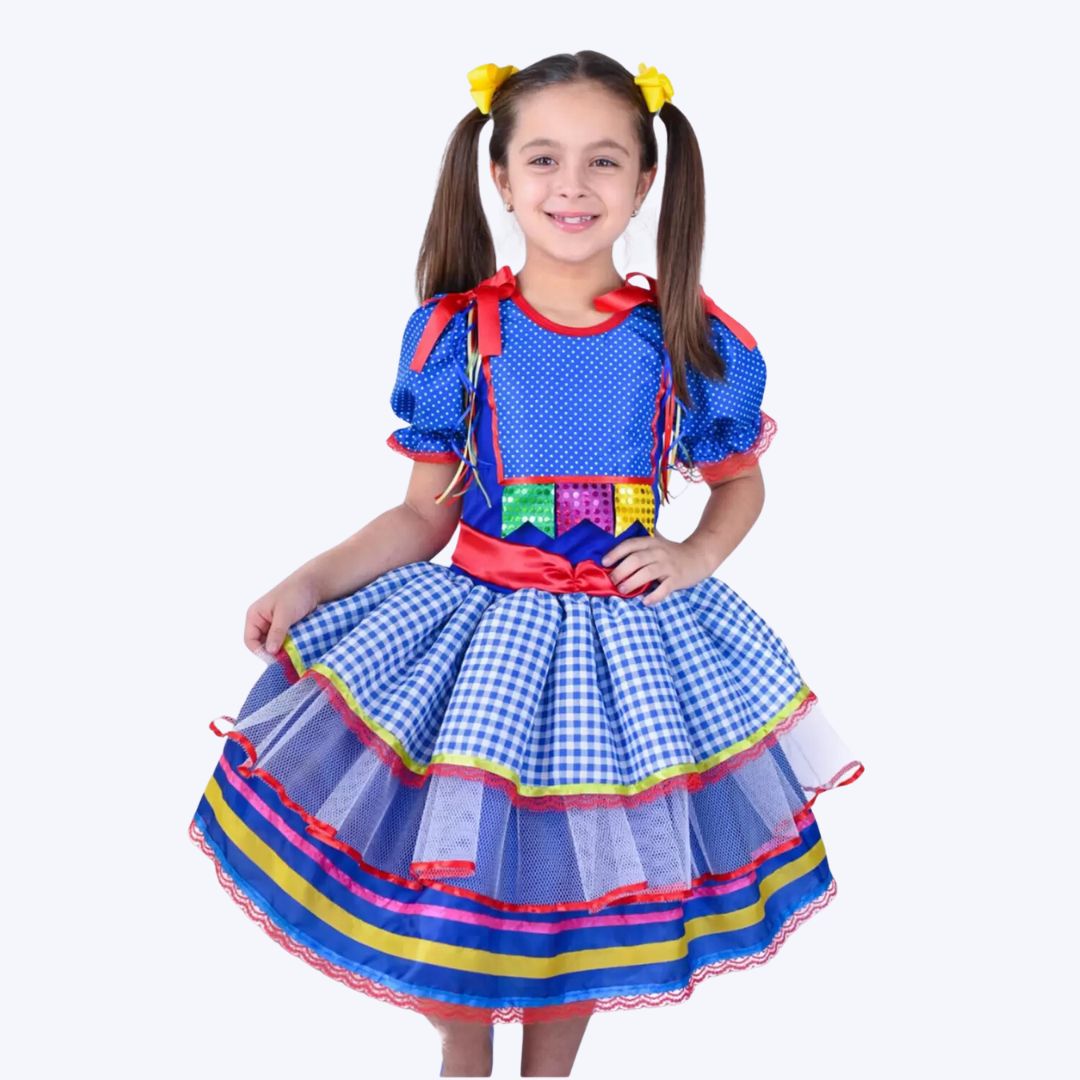 Projetado para o máximo conforto, a parte de cima do vestido é confeccionada com elastano, proporcionando flexibilidade e liberdade de movimento para a criança aproveitar ao máximo a dança e as brincadeiras típicas dessa festa. Além disso, a saia apresenta camadas de tule, não apenas para adicionar um toque de glamour, mas também para dar volume e criar um visual encantador e cheio de vivacidade.