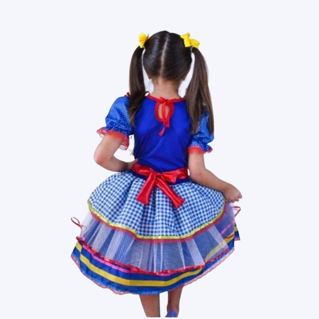 Projetado para o máximo conforto, a parte de cima do vestido é confeccionada com elastano, proporcionando flexibilidade e liberdade de movimento para a criança aproveitar ao máximo a dança e as brincadeiras típicas dessa festa. Além disso, a saia apresenta camadas de tule, não apenas para adicionar um toque de glamour, mas também para dar volume e criar um visual encantador e cheio de vivacidade.
