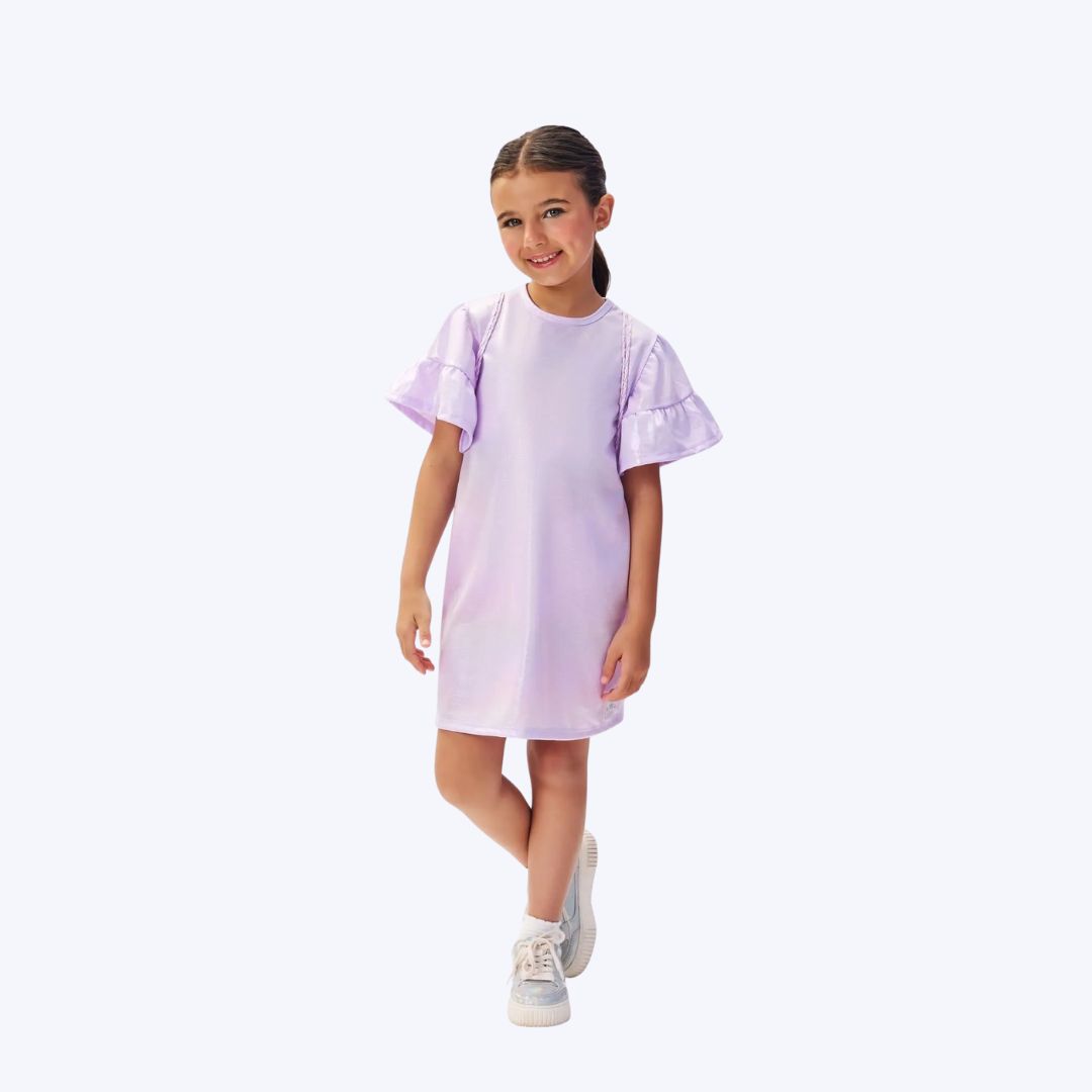 O Vestido Holográfico Lilás com Bolsinha Infantil Menina Mundo Cinti oferece conforto e estilo para as pequenas brilharem em todas as ocasiões.