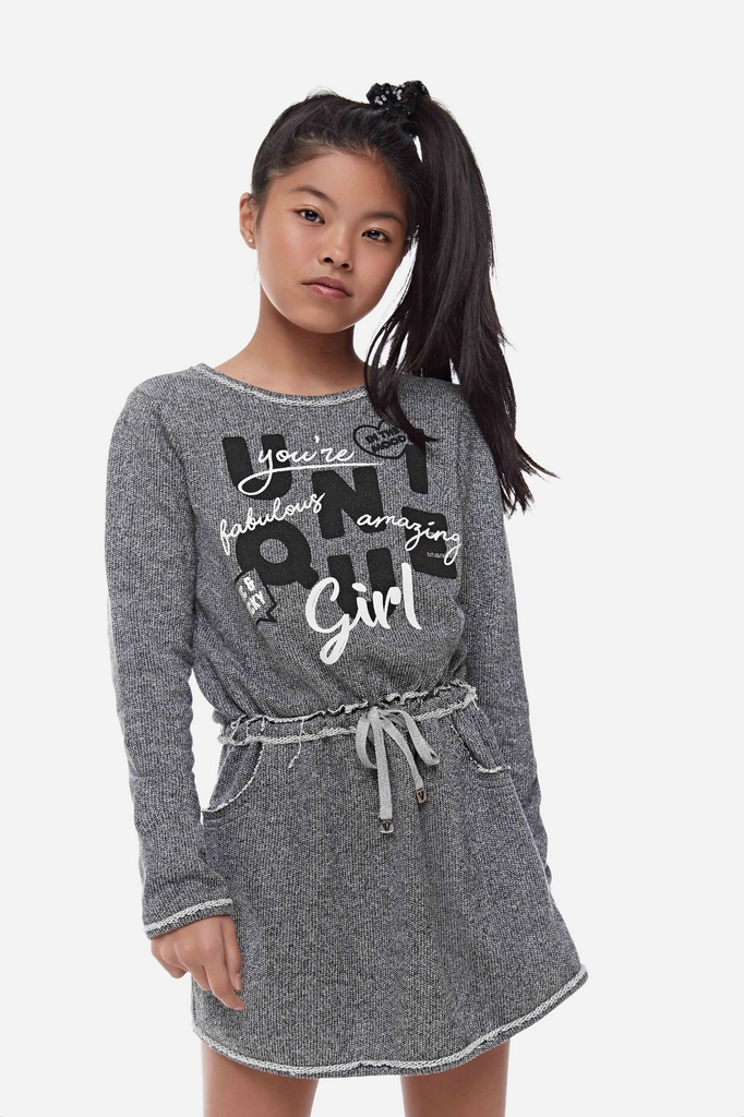 Vestido infantil da marca Vic&Vicky confeccionado com tecido de qualidade trazendo um maior conforto a criança. Vestido com elástico na cintura, possui dois bolsos frontais, escrito UNIQUE Gir,l you`re, faboulous, amazing. Modelo de vestido super estiloso e confortável. Na Se-An Junior Moda Infantil você encontra toda linha de vestidos Kyly..
