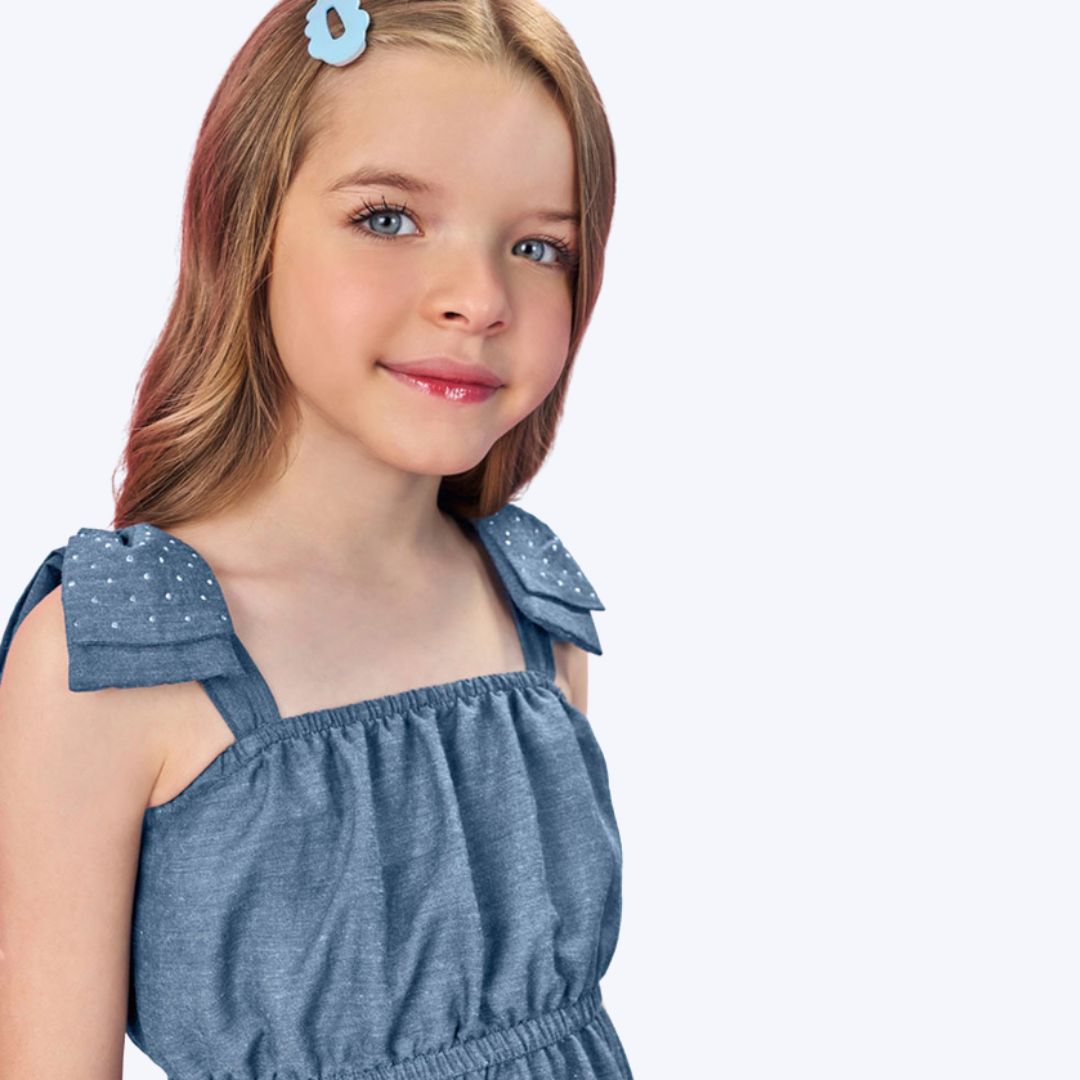 Apresentamos o encantador Vestido Jeans da Mundo Cinti, uma peça única que combina a durabilidade do jeans com a delicadeza e o charme que toda menina merece. Com sua lavagem azul clássica e design de manga curta, este vestido é ideal para diversas ocasiões, desde festas e passeios até um aconchegante almoço em família. Sua pequena se sentirá uma verdadeira princesa, graças aos detalhes cuidadosamente elaborados, como as alças com delicados laços e o toque sutil de strass, que adicionam um brilho especial a cada movimento. O tecido é leve e super confortável, garantindo total liberdade para as meninas brincarem e se movimentarem com facilidade, sem abrir mão do estilo CINTI.