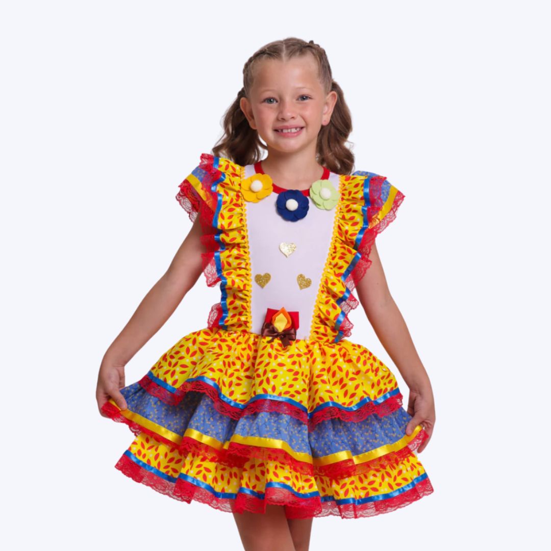 Feito com tecido leve, macio e respirável, ele é perfeito para os dias mais quentes de arraial, permitindo que as crianças brinquem e dancem com total conforto. A estampa vibrante de folhagem vermelha sobre fundo amarelo dá um toque original e alegre ao visual junino, enquanto os acabamentos em renda, babados e bordados delicados completam o look com muito charme e sofisticação.
