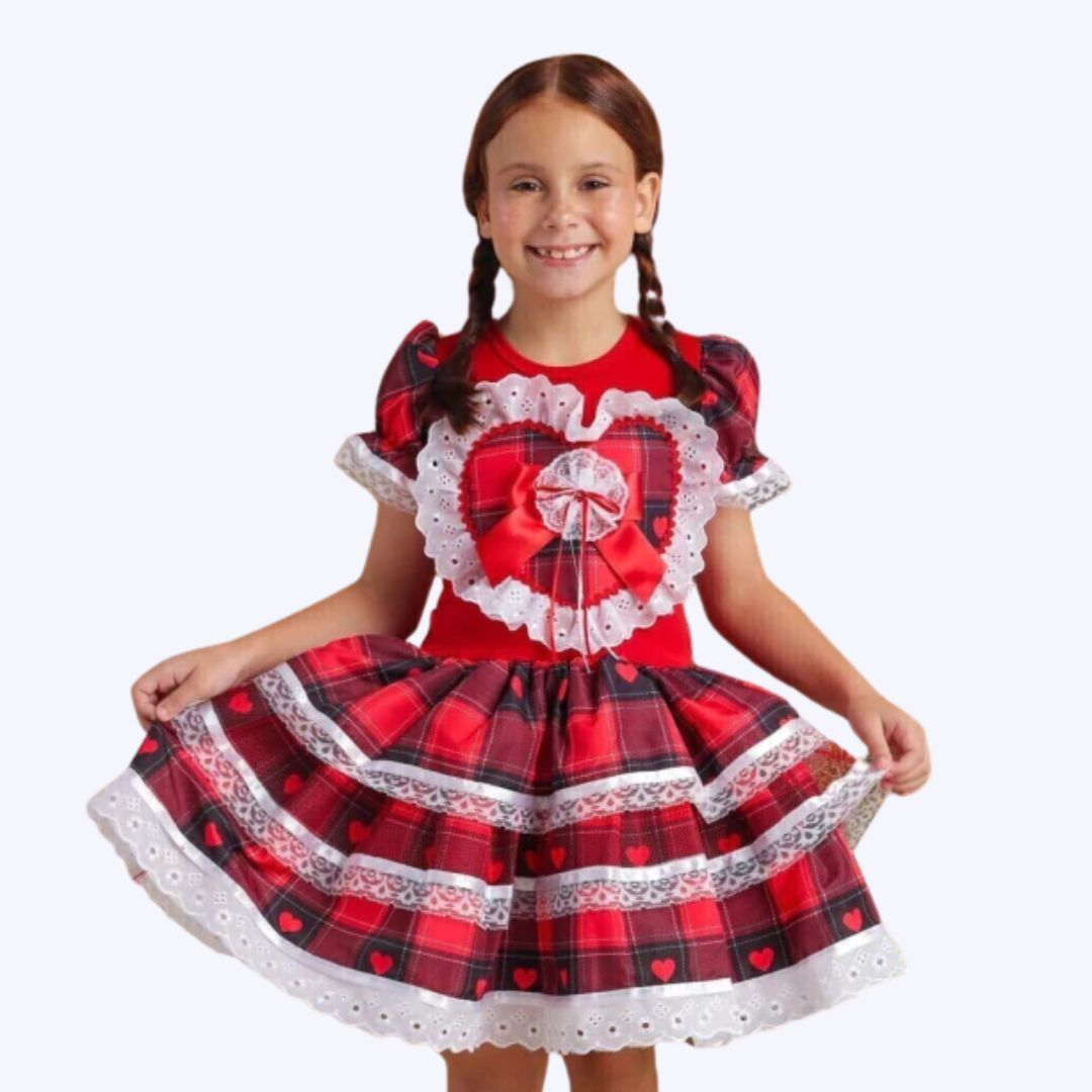 Vestido Junino Xadrez Vermelho com Coração Infantil Menina Muvile