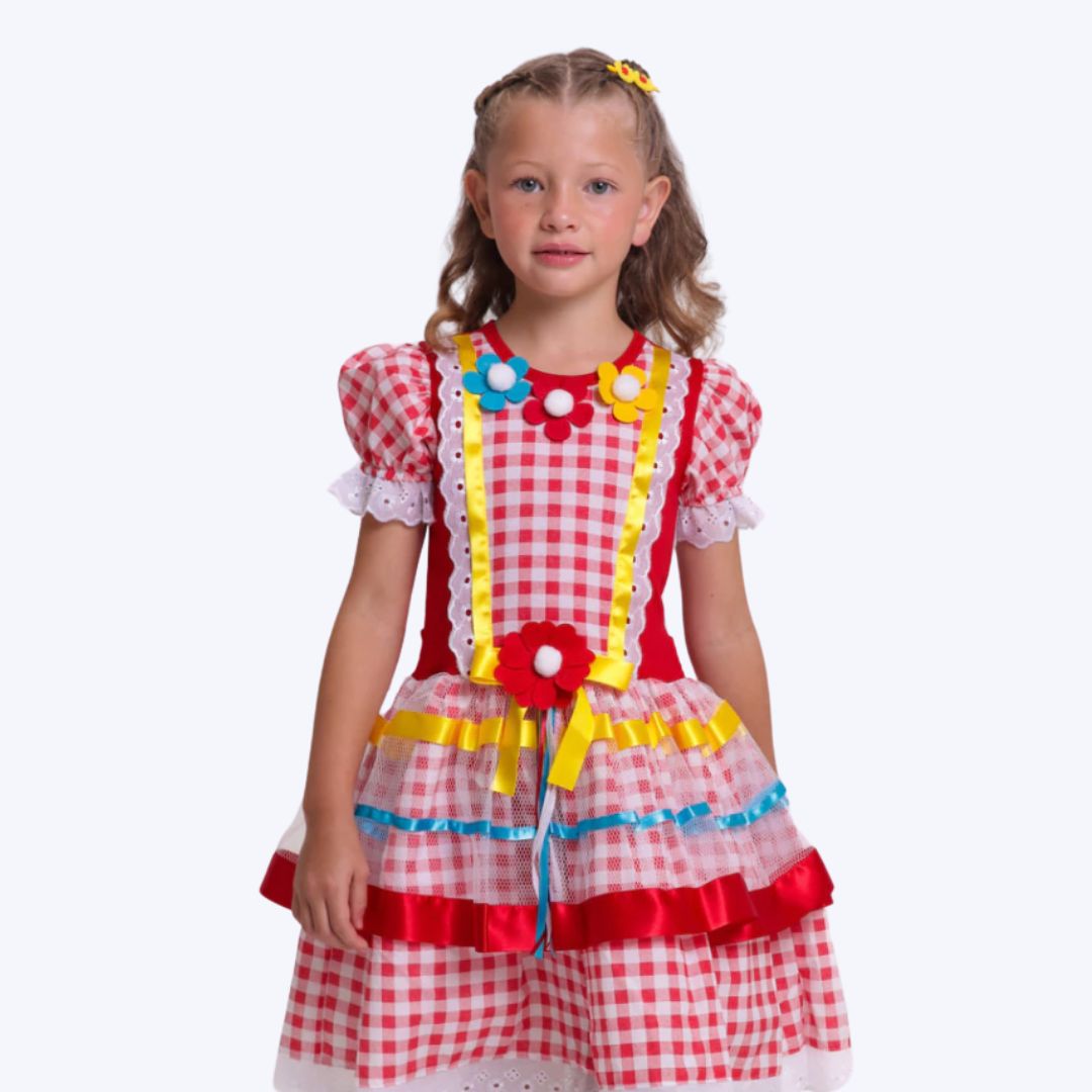 Confeccionado em tecido leve e respirável, proporciona liberdade de movimento para que as pequenas possam brincar, dançar e se divertir com total conforto. A saia em camadas com tule delicado adiciona um toque de encanto e volume, enquanto o xadrez vermelho vibrante, os bordados florais e os detalhes típicos juninos tornam essa peça ainda mais especial.
