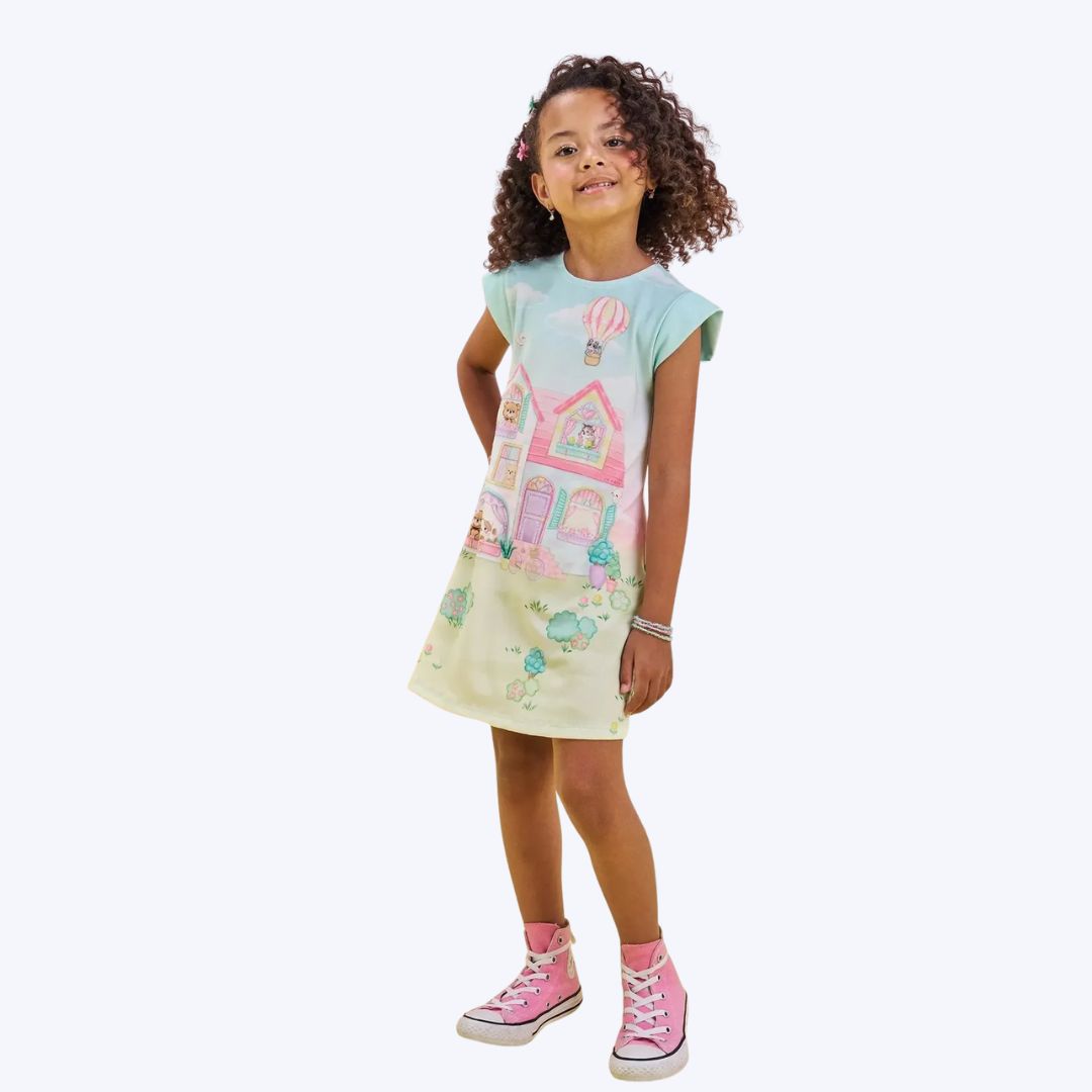 O caimento soltinho e o tecido elástico tornam o vestido fácil de vestir, otimizando o tempo dos pais e a diversão das crianças.