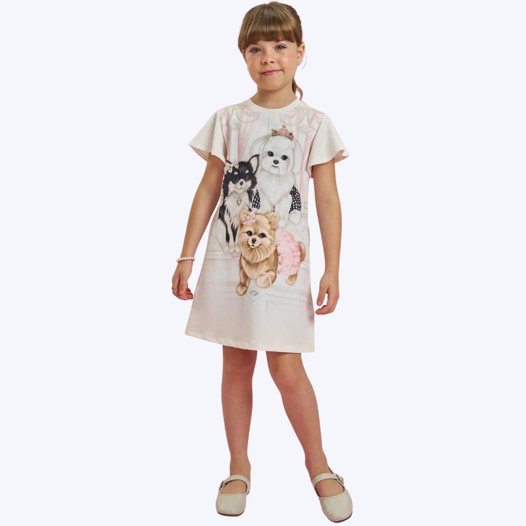 O Vestido Manga Curta em Molevisco Off White é a escolha perfeita para garantir conforto e elegância às crianças. Confeccionado em molevisco, este tecido inovador combina leveza, elasticidade e um toque macio, proporcionando bem-estar durante todo o dia. Na sofisticada cor off white com aparência de linho, o modelo se destaca por sua estampa sublimada divertida, enriquecida com delicadas aplicações de strass e um charmoso pin com pérola. Esses detalhes exclusivos adicionam um toque de sofisticação e encanto à peça, tornando-a ideal para passeios, festas e ocasiões especiais que exigem um look refinado sem abrir mão do conforto. A composição cuidadosa, com poliéster, viscose, linho e elastano, garante durabilidade e um caimento impecável para as pequenas.