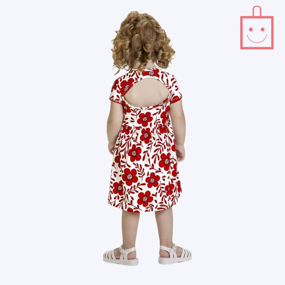 A estampa de flores vibrante e delicada traz um toque de frescor e alegria à peça, tornando o visual da menina ainda mais encantador. O decote redondo e o detalhe nas costas, com acabamento em debrum, adicionam um toque sofisticado e delicado ao design. As mangas em ponta concha trazem um charme especial, conferindo um estilo único e moderno, sem deixar de lado o conforto.