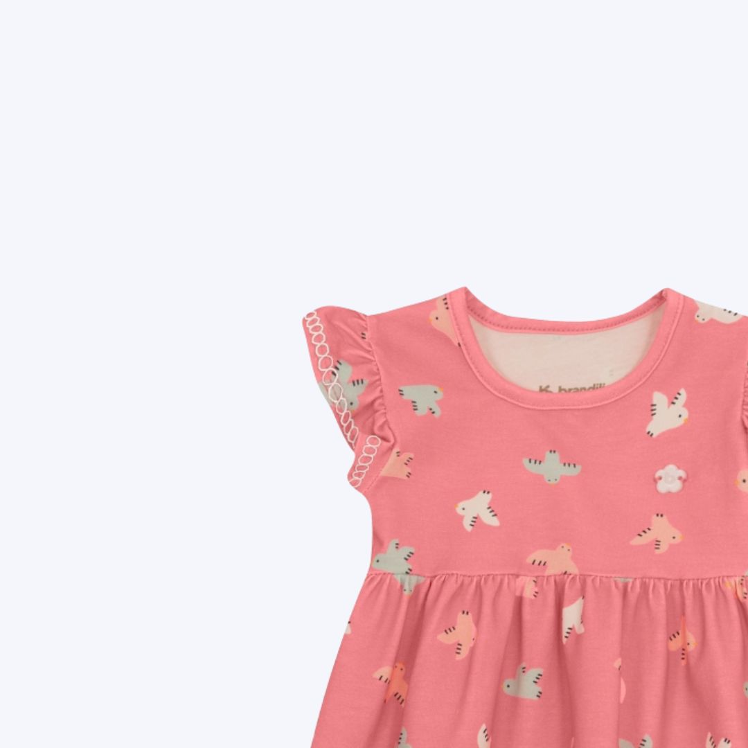 curta que proporciona frescor e liberdade de movimento. A exclusiva estampa rotativa de passarinhos adiciona um toque de delicadeza e diversão ao visual. Disponível nas cores rosa e off white, é uma peça versátil e indispensável para passeios, festas ou momentos especiais em família.