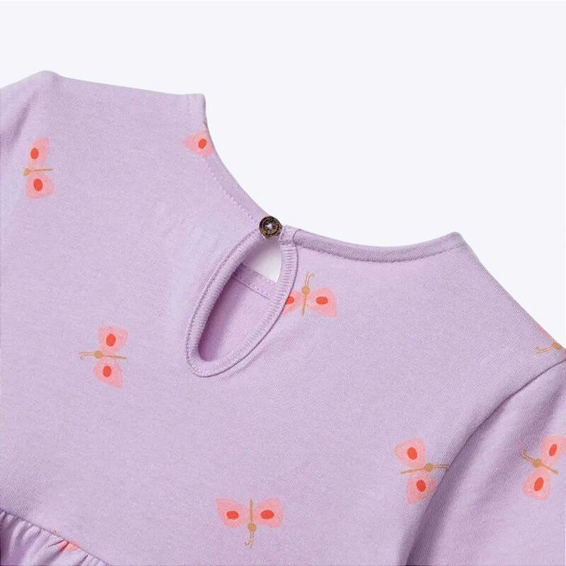 Deixe sua pequena brilhar com o encantador Vestido Manga Curta Lilás Estampado da Hering Kids! Este vestido é a combinação perfeita de estilo, conforto e praticidade, ideal para os dias quentes.