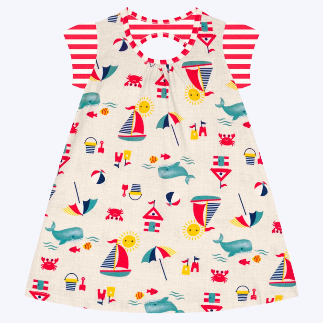 • Design Estiloso: O vestido apresenta um clássico padrão listrado nas mangas curtas, um verdadeiro ícone das coleções de verão. A estampa rotativa, rica em elementos de praia, é supercolorida e divertida, trazendo um toque de fantasia e alegria à peça.