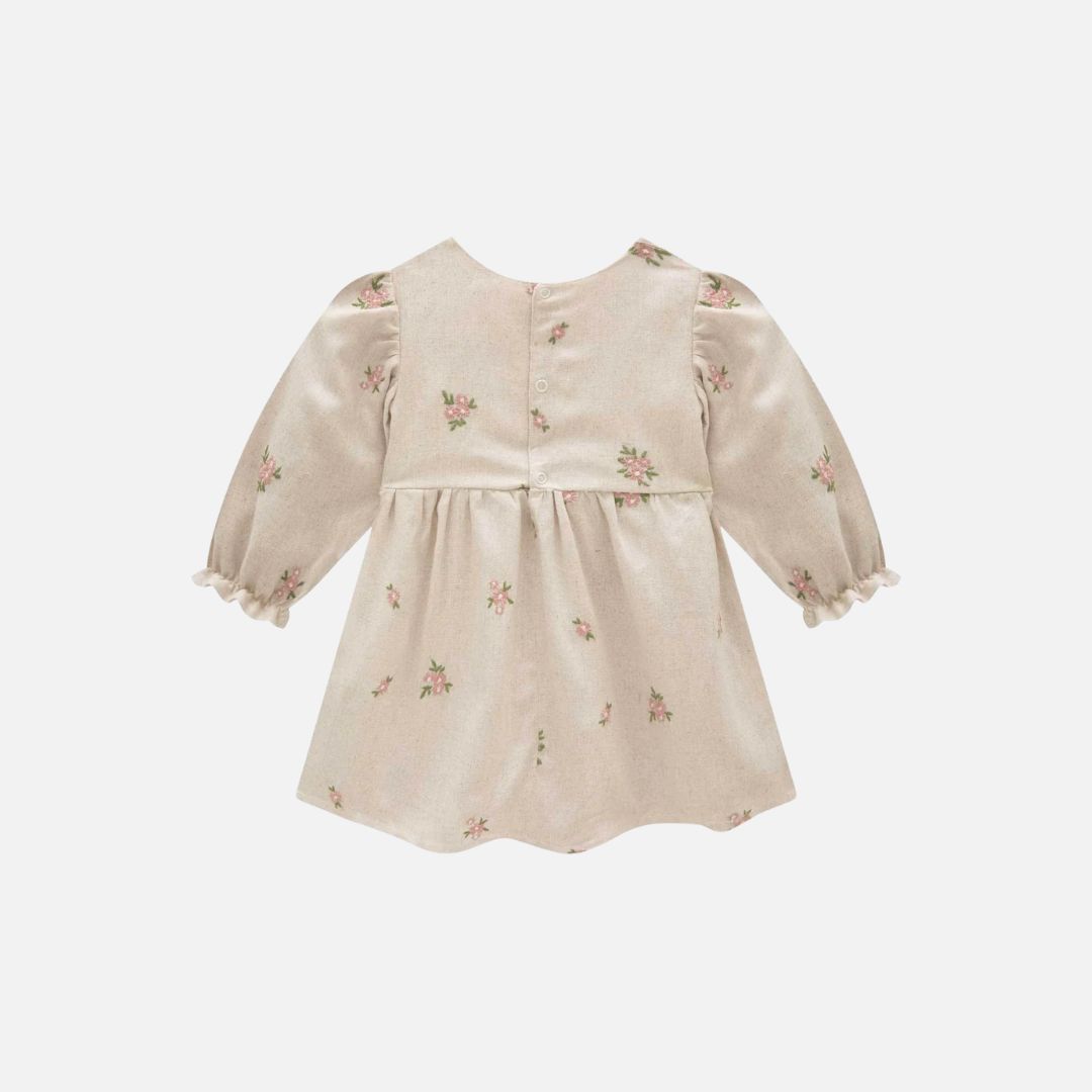Vestido Manga Longa em Linho Bordado Flores Bebê Menina Infanti