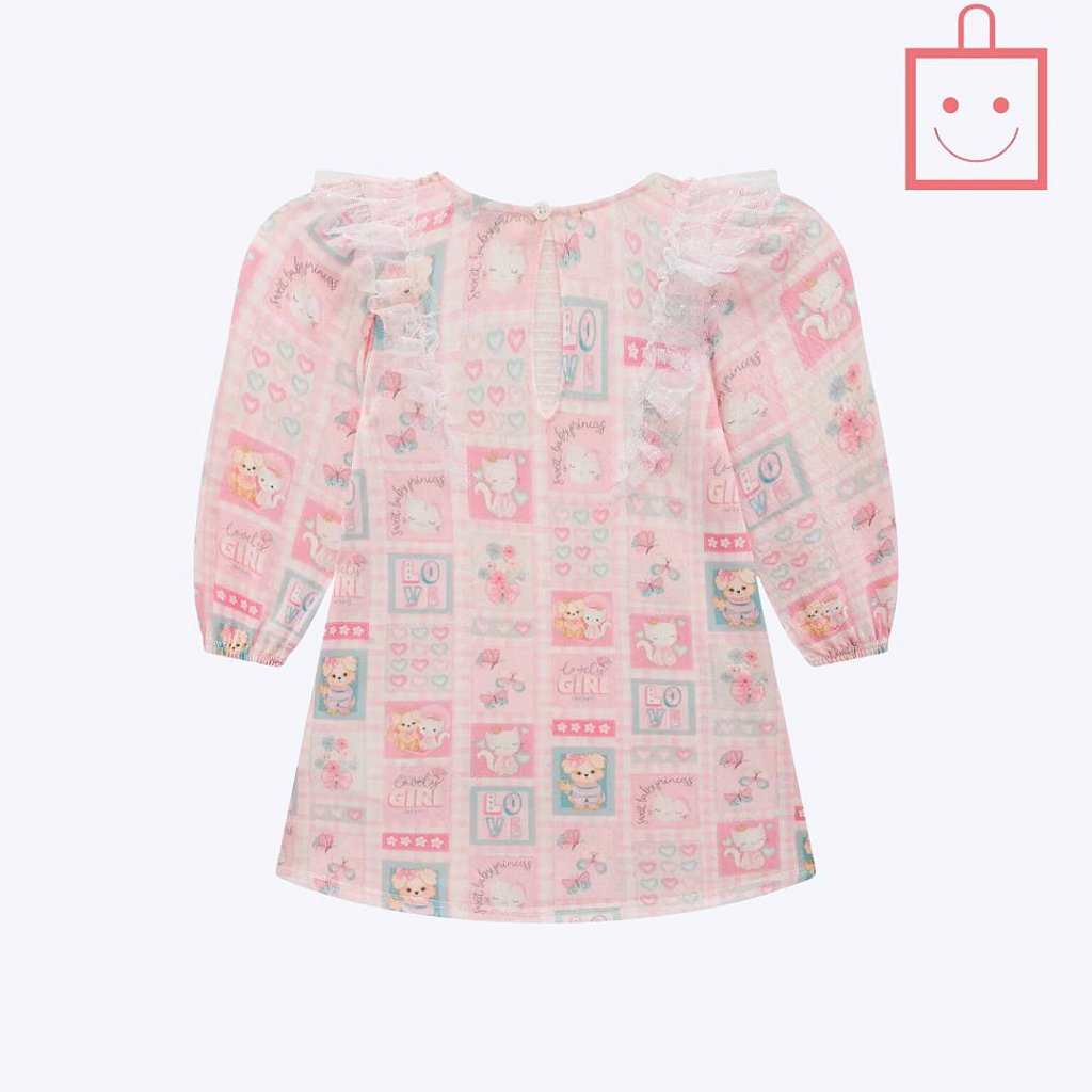 O vestido possui tule poá nos ombros em um suave tom de rosa, adicionando um toque de sofisticação e feminilidade à peça. O desenho estampado em toda a peça é encantador e traz um elemento lúdico e colorido ao visual da bebê.