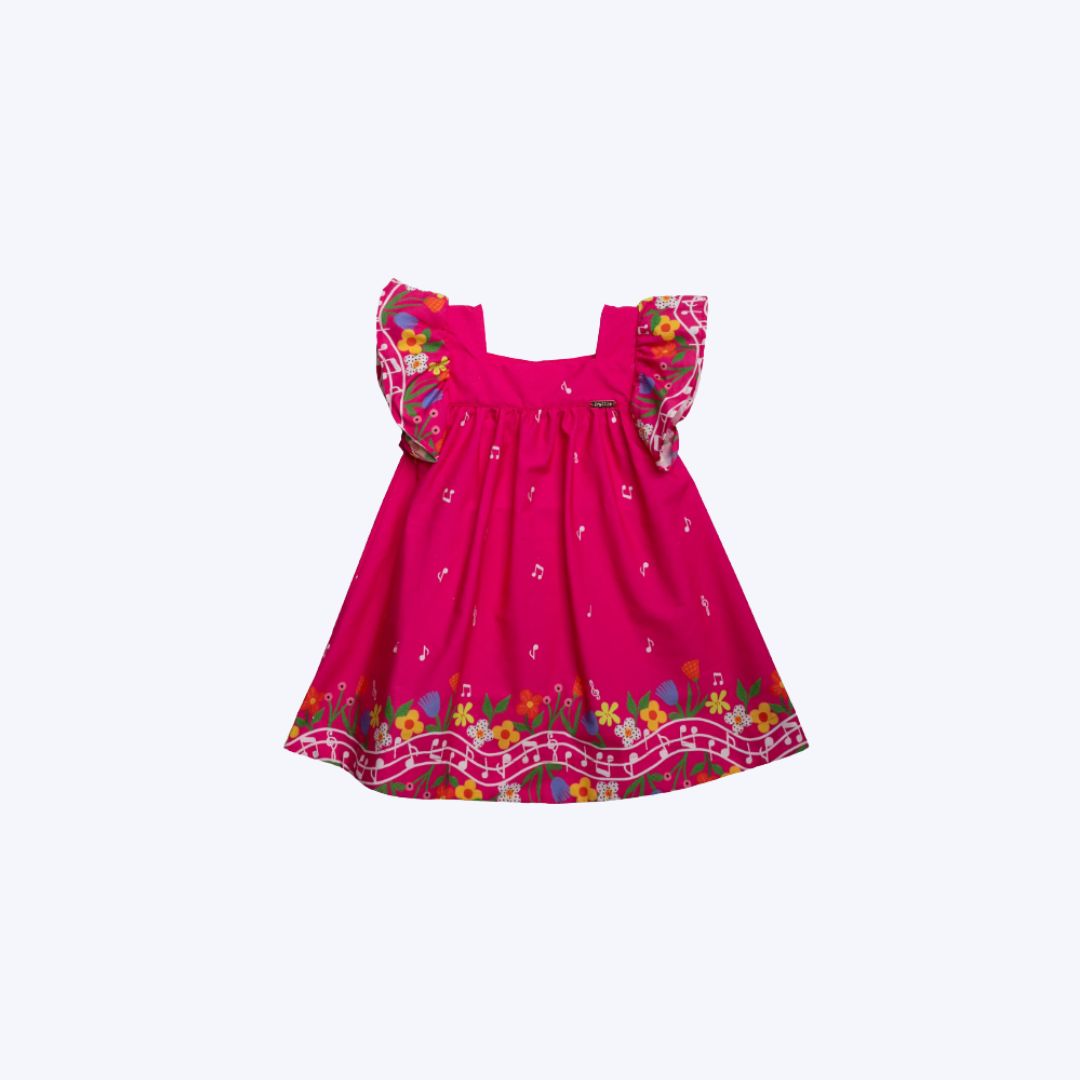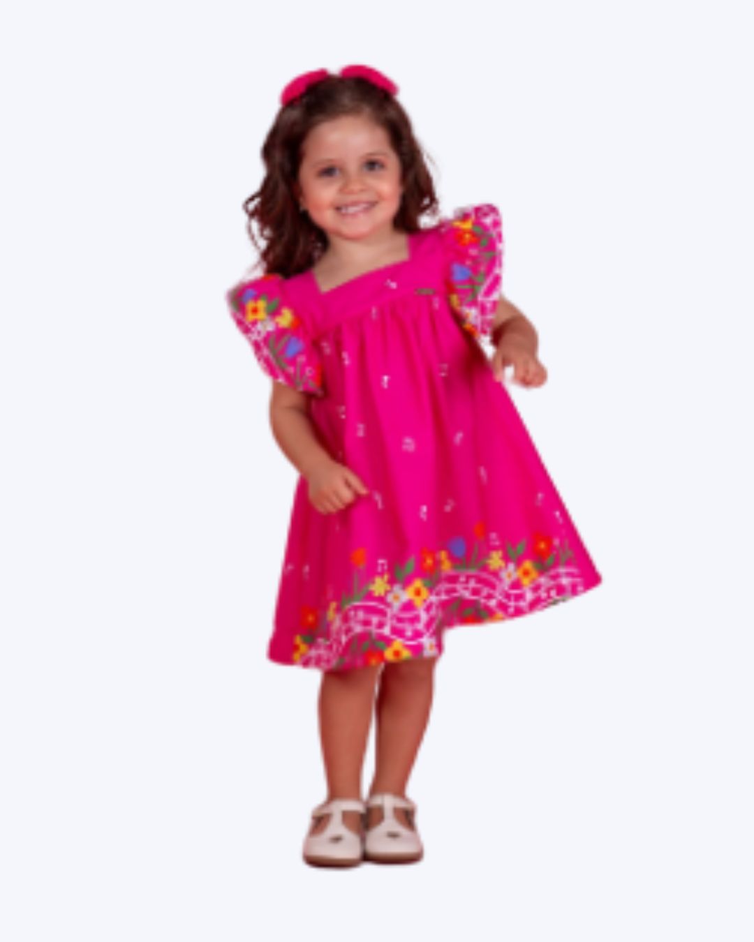 A cor Rosa Pink vibrante com o barrado de flores proporciona um visual alegre e sofisticado, destacando a beleza natural da criança.