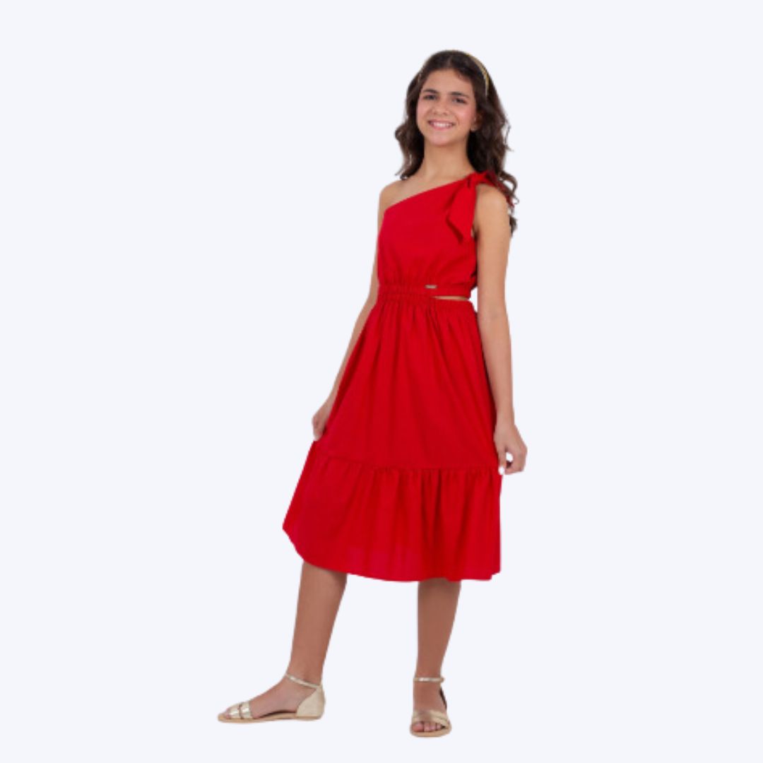 Com o Vestido Vermelho Ombro Único Juvenil, sua filha estará pronta para arrasar com um visual moderno, elegante e superconfortável, perfeito para as ocasiões especiais e para se divertir com liberdade.